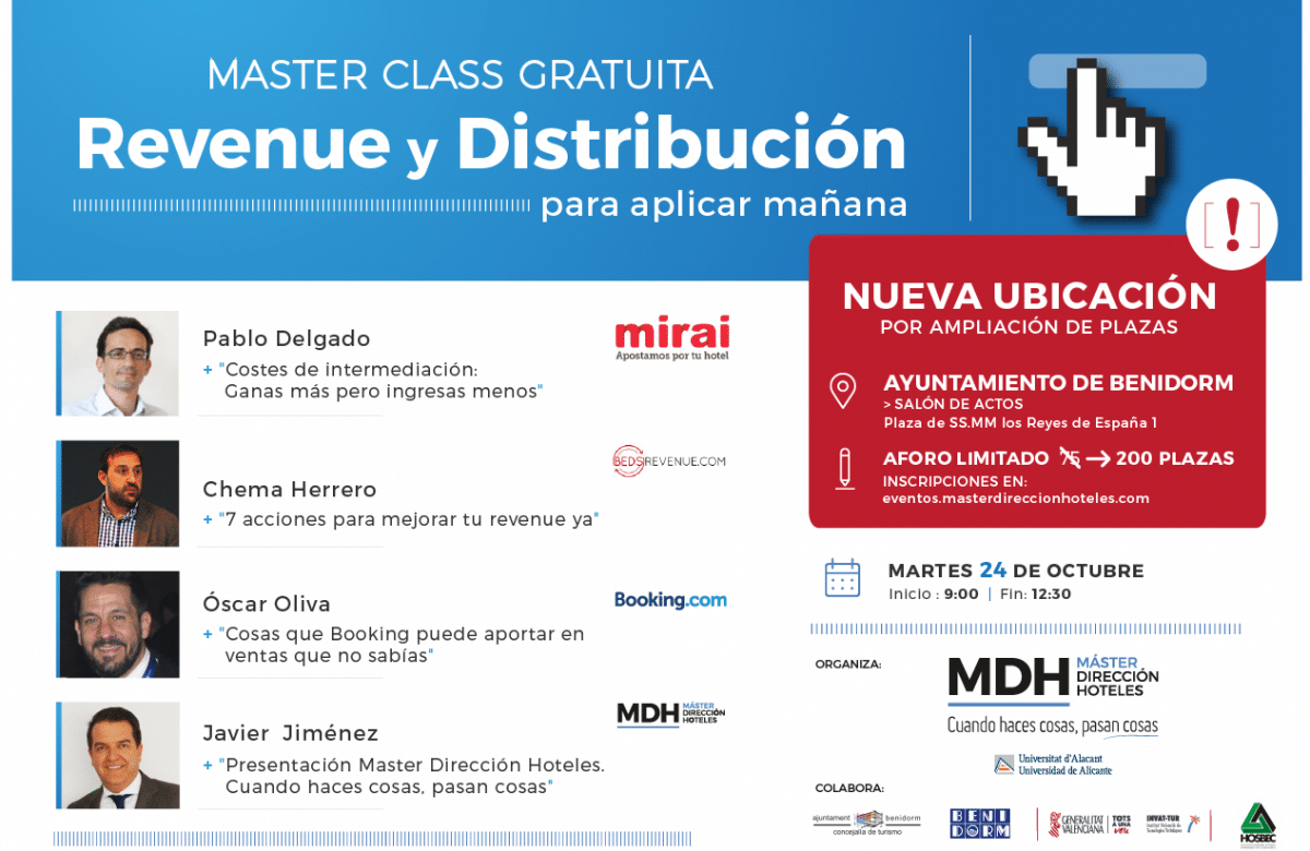 Se acerca la fecha de inicio del Máster en Dirección de Hoteles y queríamos compartir con vosotros una pequeña muestra de todo lo que os puede aportar. Por ello, hemos organizado una Master Class sobre Revenue y Distribución con la colaboración del Ayuntamiento de Benidorm, INVATTUR y HOSBEC.